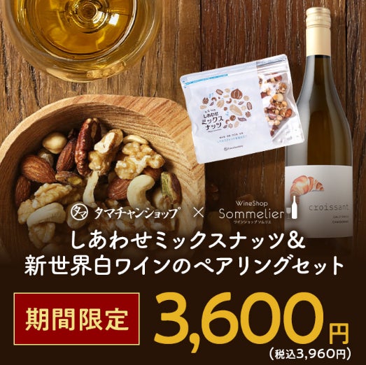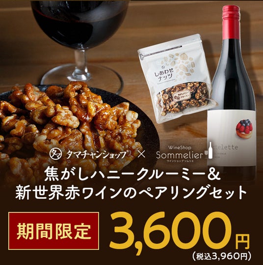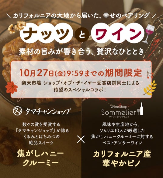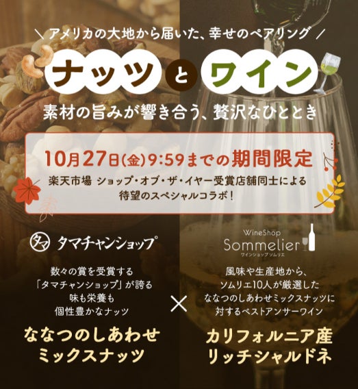今回は、楽天市場で8度のショップ・オブ・ザ・イヤー(SOY)※を誇る健康食品専門店「タマチャンショップ」とのコラボレーションが実現し、ナッツとワインのペアリングを楽しめる、秋限定の特別セットが登場します。