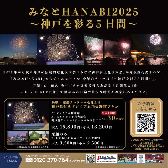 神戸みなとHANABI NIGHTクルーズでは、3日間限定のプレミアム「神戸食」と、神戸港の夜空に打ち上がる「音楽とシンクロした花火」の boh boh KOBE船上でしか味わえないマリアージュがご堪能いただけます。 他にはない感動体験をぜひboh boh KOBEでお過ごしください。