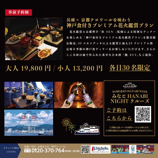 船上より、陸上から見上げる花火とは一味違う特別な夜を体験していただけることはもちろん、プレミアム花火鑑賞プランをご購入のお客様には、ミシュランガイド一つ星を獲得している京都の料亭「杦-SEN-」の杉澤料理長監修の3日間に合わせた特別な「神戸食」をお召し上がりいただけます。日本の食文化とこだわりぬいた神戸の食材が織りなす、boh boh KOBEでしか味わえない「神戸食」を一緒にご堪能ください。