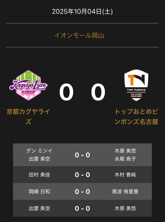 ノジマTリーグ 2025-2026シーズン 公式戦 10月4日開催 京都カグヤライズ vs トップおとめピンポンズ名古屋 対戦オーダー発表
