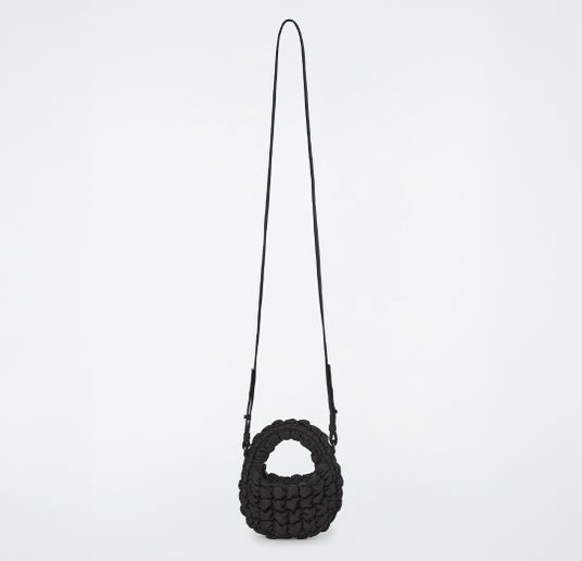 コレクションの要ともいえるキルトバックのナノサイズは、特徴的な枕のような質感のリサイクル生地を使用し、小さな必需品が収まるサイズに仕上げられています。ショルダーストラップでクロスボディにしたり、同系色のループで大きなバッグとつなげたりして、レイヤードバッグにもお使いいただけます。