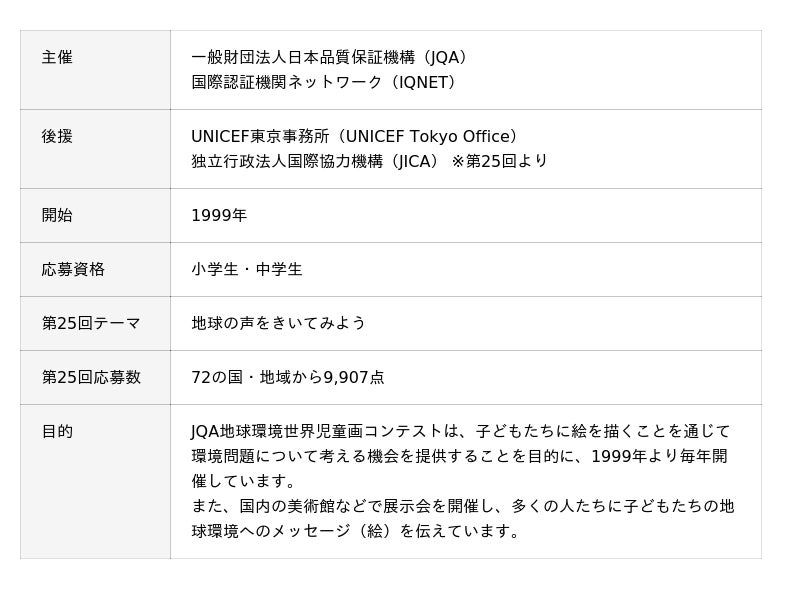一般財団法人日本品質保証機構(東京都千代田区、理事長:石井 裕晶、略称:JQA)と国際認証機関ネットワーク(スイス・ジュネーブ、略称:IQNET)が主催し、UNICEF東京事務所(東京都渋谷区)と独立行政法人国際協力機構(東京都千代田区、略称:JICA)の後援(※)による「JQA地球環境世界児童画コンテスト」は、1999年より開催しております。