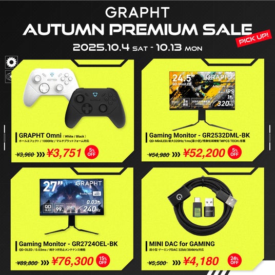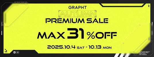 この度、2025年10月4日(土)から10月13日(月)まで『GRAPHT AUTUMN PREMIUM SALE』を開催します。本セールは、GRAPHT OFFICIAL STORE(ECサイト)、GAMING CENTER by GRAPHT Amazonブランドストア、および全国の家電量販店やPC専門店などで一斉に実施。7月に発売されたばかりのモニターや、ゲームパッド、イヤホンなど、ゲーミングライフをアップグレードする12製品を、最大31%オフの特別価格でご提供いたします。この機会にぜひGRAPHT製品をお得にお求めいただければ幸いです。