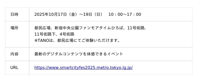 TANOTECH株式会社は、2025年10月17日(金)~19日(日)まで西新宿で最先端のデジタルコンテンツが大集結したスマートサービスが体験できる「スマートシティフェスタ」に昨年度に引き続き出展します。今回の「スマートシティフェスタ」では、未来のまちづくりにおける「健康・福祉 × テクノロジー」の可能性を体験いただける展示を予定しており、来場者の皆さまに実際にTANOをご体験いただけます。
