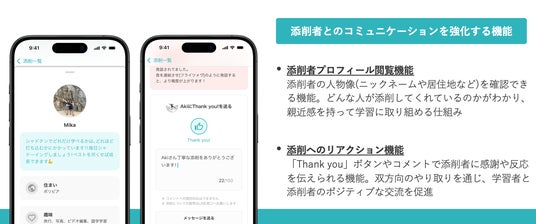 学習者と添削者の距離を近づける機能も実装しており、双方向のコミュニケーションを通じて、人との関わりが学びを前向きにする体験を目指しています。