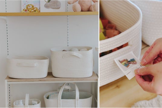 写真や絵を貼ることでこどもにもわかりやすく、一人でお片付けをすることができます。