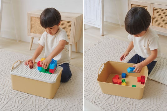 フタ部分で遊ぶことができ、そのままお片付けすることができます。また、2個までスタッキングすることもできます。