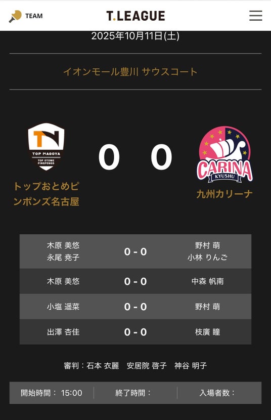 ノジマTリーグ 2025-2026シーズン 公式戦 10月11日開催 トップおとめピンポンズ名古屋vs九州カリーナ対戦オーダー発表