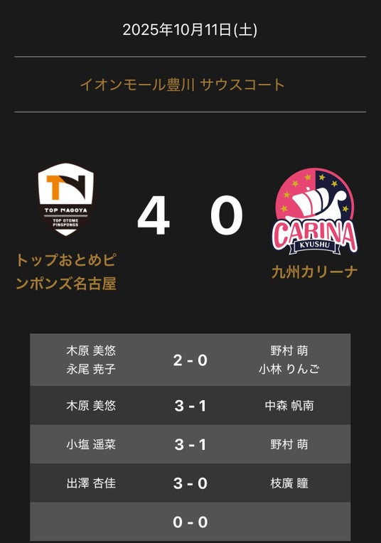 ノジマTリーグ 2025-2026シーズン 公式戦 10月11日開催 トップおとめピンポンズ名古屋vs九州カリーナの試合は、4-0でトップおとめピンポンズ名古屋が勝利しました。
