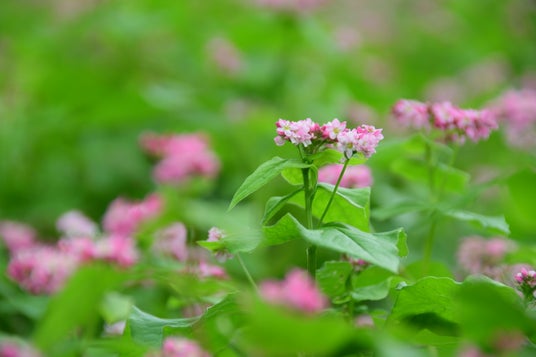 みはらしの丘ふもとの「みはらしの里」では、秋の植物がコキアの紅葉にあわせて花を咲かせます。鮮やかなオレンジ色のキバナコスモスや、こんもり丸いシルエットが可愛らしいマルチフローラマム、茨城県のブランド品種「常陸秋ソバ」と、赤い花を咲かせる「高嶺ルビー」も見どころです。また、常陸秋ソバの花畑では、扉のフォトスポットも設置。扉の向こうに広がるコキアを背景に記念撮影をお楽しみください。