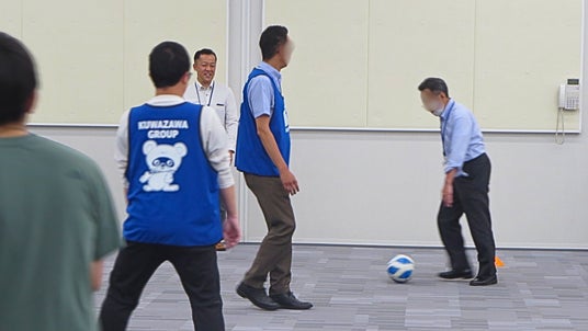 クワザワグループのマスコットキャラクター「たんたん」も、ウォーキングフットボールに挑戦しています。親子はもちろん、小さいお子様からご年配の方まで、みなさま楽しめる内容となっております。