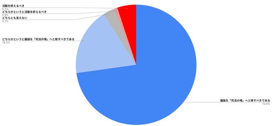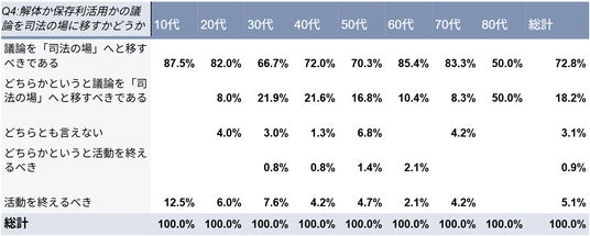 アンケートでは、すべての年代において約9割という高い割合で、活動を司法の場へと移行することに対して肯定的な意見が示されました。