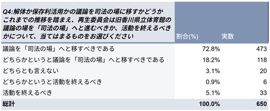 質問文:Q4:解体か保存利活用かの議論を司法の場に移すかどうかこれまでの推移を踏まえ、再生委員会は旧香川県立体育館の議論の場を「司法の場」へと進むべきか、活動を終えるべきかについて、当てはまるものをお選びください