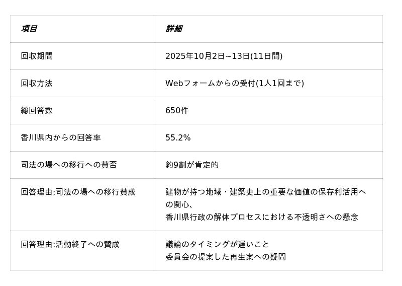 寄せられた自由意見には、丹下健三氏設計の旧体育館が持つ文化的な重要性を守りたいという思いに加え、香川県が進める解体プロセスの不透明さに対する疑問が反映されていました。
