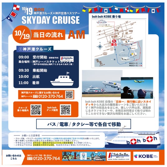 神戸シーバスboh boh KOBEは、10月19日(日)に、空の日イベントとして、神戸港クルーズ×神戸空港バスツアー『SKY DAY CRUISE』開催いたします!