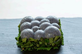 2.中層: 黒胡麻をたっぷり練り込んだティラミスクリームが、石畳の斑模様と質 感を表現しています。胡麻の香ばしさとコクが深く、なめらかな口どけでありなが らも和の趣を感じさせる独創的な味わいです。また、ティラミスクリームの中に六条大麦(福井県産)のパフを入れ、食感のアクセントを加えています。