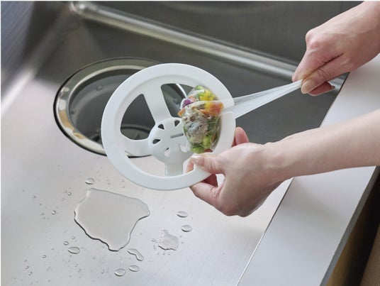 生ゴミの入ったネットを素手で絞るのは抵抗がある方に、生ゴミに直接触れることなく、ネットをスリットに通して引っ張るだけ、簡単に水切れを可能にした新発想の排水口ネットホルダー。