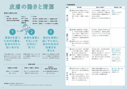 本教材は、日々の保健指導をはじめ、総合的な学習の時間や理科、体育(保健)などのさまざまな授業で活用いただけます。授業に導入いただきやすいよう、教員の方向けの指導書も用意。「皮膚の働きと清潔」「思春期に起こる体の変化」「太陽の光と紫外線について」といったテーマでの授業展開例を紹介しています。