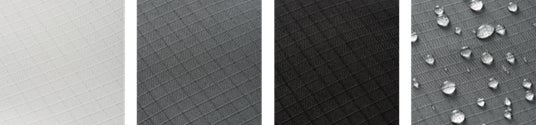 ※左からライトグレー、ダークグレー、ブラック、撥水のイメージ。※耐水圧試験(JIS 1092 B 法)にて実証済み。