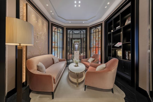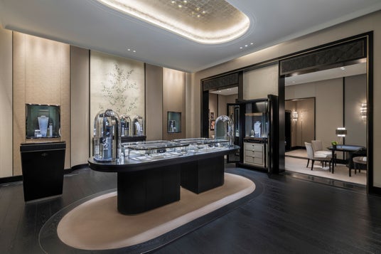 ブティック奥のプライベートな空間には、ヴァン クリーフ&アーペルの物語を伝える書籍やオブジェが並び、その魅惑的な世界を紹介します。また、このブティックではエレガントで広々とした2つのVIPルームをご用意しています。1階の「アールデコ サロン」は、大胆な幾何学模様やゴールドなどのモチーフを取り入れた洗練されたデザインが特徴です。2階の「ポエティック サロン」は、明るく柔らかな色調で、メゾンのポジティブなビジョンを体現します。壁には花や動物をモチーフにした、緻密な手刺繍を施したパネルがあしらわれました。