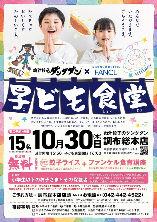 この度、2025年10月30日(木) に、肉汁餃子のダンダダン調布総本店にて、肉汁餃子のダンダダンと株式会社ファンケル(本社:横浜市中区、代表取締役社長 執行役員:三橋 英記)で「子ども食堂」を共催します。