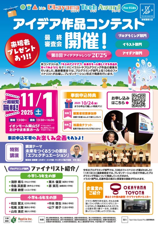 次世代を担う岡山の小学生たちが、技術力や創造力を発揮できる場として注目を集める「Okayama Tech Award For Kids(以下、OTA)」の最終審査会が、2025年11月1日(土)、イオンモール岡山5階・おかやま未来ホールで開催します。