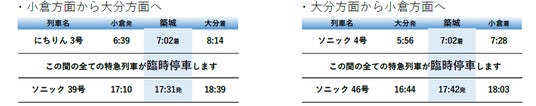 小倉・行橋~築城~宇島・中津間において、臨時普通列車を運転します。時刻の詳細につきましてはJR九州ホームページ「駅別時刻表」をご参照ください。