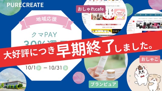 EC通販サイト「アーチホールセール」「おしゃれcafe」などを運営するピュアクリエイト株式会社(本社:埼玉県熊谷市)は、現在参加中の熊谷市地域通貨「クマPAY」30%ポイント還元キャンペーンが、当初の予想を大幅に上回るご好評につき、市の予算上限に達したため、2025年10月15日(水)をもって早期終了となりました。キャンペーン期間中は、多くのお客様にご来店いただき、心より感謝申し上げます。