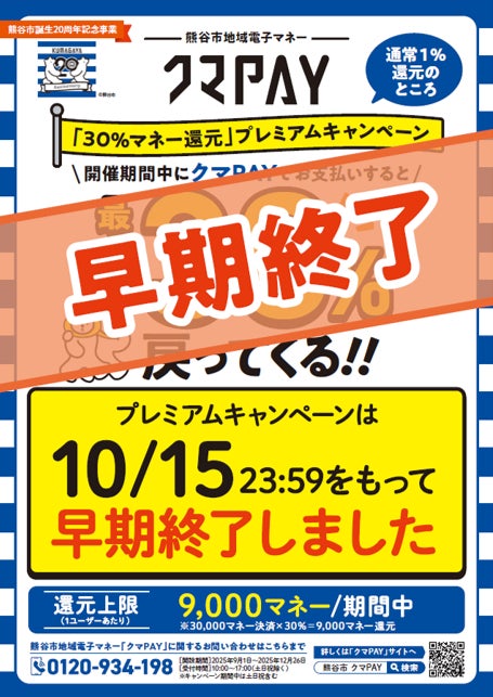 【感謝とご報告】大好評につき、熊谷市「クマPAY」30%還元キャンペーンは10月15日をもって早期終了。