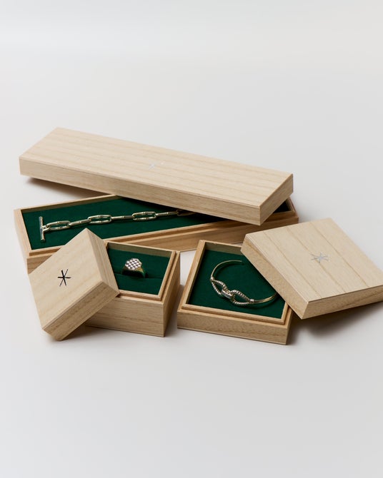KESSAKUのジュエリーは、伝統的な桐箱に収めてお届けします。時とともに味わいを深める木肌と、静けさの中に宿る日本の美意識を感じてください。