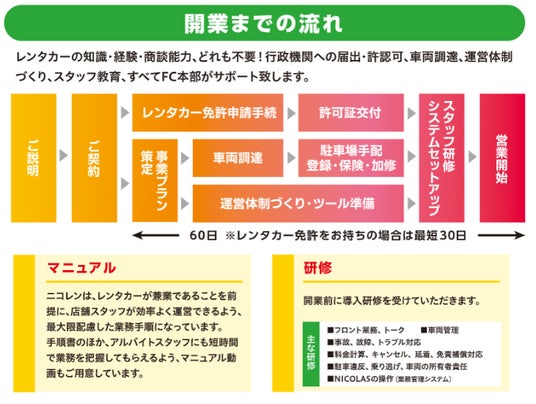 未経験でも安心!手厚い開業支援レンタカー事業免許の取得から、事業計画の策定、運営オペレーションのレクチャー迄FC本部が丁寧にサポートいたします。未経験でも”即”運営できるようになる業務マニュアル・研修制度完備!