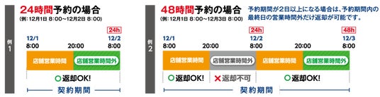 予約時に「返却時間」の項目で営業時間外の項目を選択すると、閉店から翌朝の営業開始時刻までの間、好きな時間に返却できます。なお、予約期間が2日以上になる場合は、予約期間内の最終日の営業時間外にだけ返却が可能です。