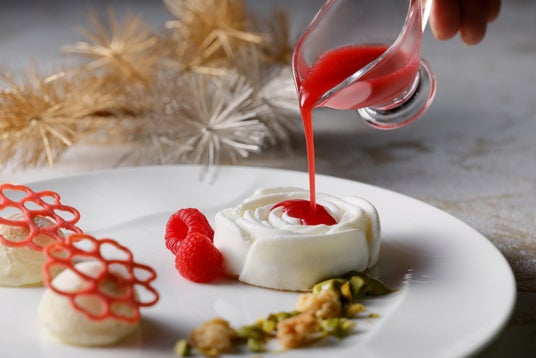 滋賀県が誇るブランド牛「近江牛」をメインに、目の前で仕上げるお料理を楽しむディナーコース。食後には、滋賀県・山田牧場のチーズを使用した純白のフロマージュが登場。白いバラがオウミキイチゴのソースで鮮やかな赤に染まるドラマティックな演出が、お二人の特別な夜に華を添えます。