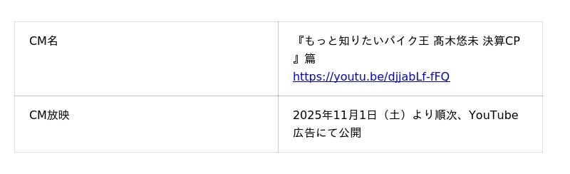 同時に、高木さん本人が出演し、同じくバイク王公式アンバサダーの「虹色侍 ずま」さんの楽曲に合わせてチャーミングにダンスを披露するWEBCM「もっと知りたいバイク王 高木悠未 決算CP篇(以下「新CM」)」を、2025年11月1日(土)より公開いたします。