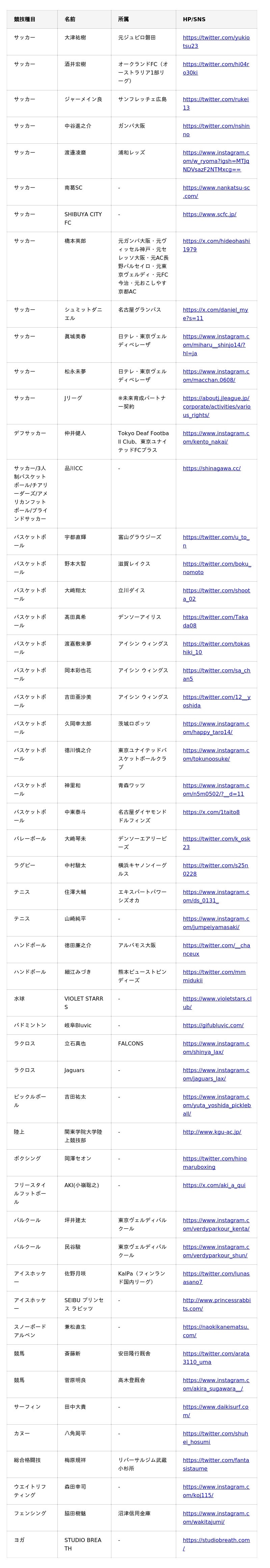 <BASE UP SPORTS サプライヤー契約一覧(現時点)>