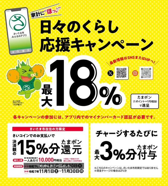 本キャンペーンは、さいたま市民が「みんなのアプリ」内の電子マネー「さいコイン」で決済すると、最大15%のポイント還元、さらにチャージ時の最大3%還元により、合計最大18%相当が戻ってくるお得な施策です。
