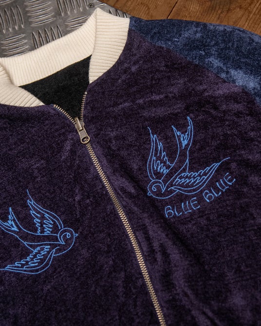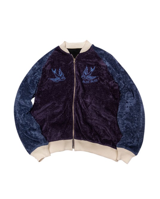 〈BLUE BLUE(ブルーブルー)〉より、高級ベルベットのような深みのある表情を持つモール糸を用い、ニットならではの柔軟性と存在感のある、リバーシブルスカジャンが登場しました。