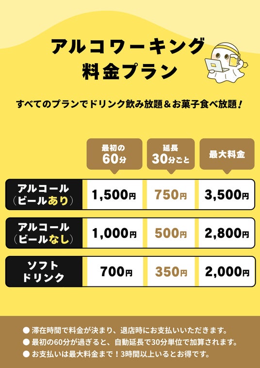 お酒飲み放題のコワーキングスペース「アルコワーキング」が、料金プランを変更。1時間1,000円から利用でき、昼からせんべろもできるように。お酒はセルフ形式の飲み放題で、作業や会話など自由に使えます。
