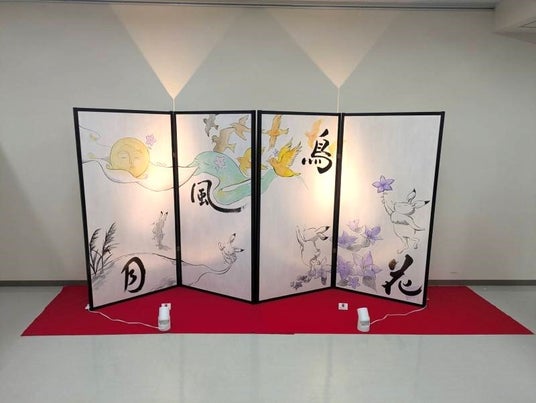 実証実験に用いた屏風作品『花鳥風月』青陵高校美術部と書道部による合作