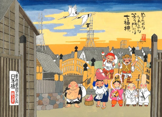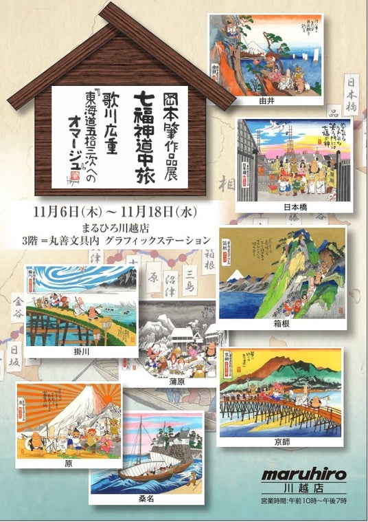 岡本肇作品展『七福神道中旅 ~歌川広重「東海道五拾三次」へのオマージュ』@まるひろ川越店3階。11/6~11/18まで。原画、版画を展示販売。七福神ご一行様が日本中に笑顔と温もりを届ける旅が始まる。