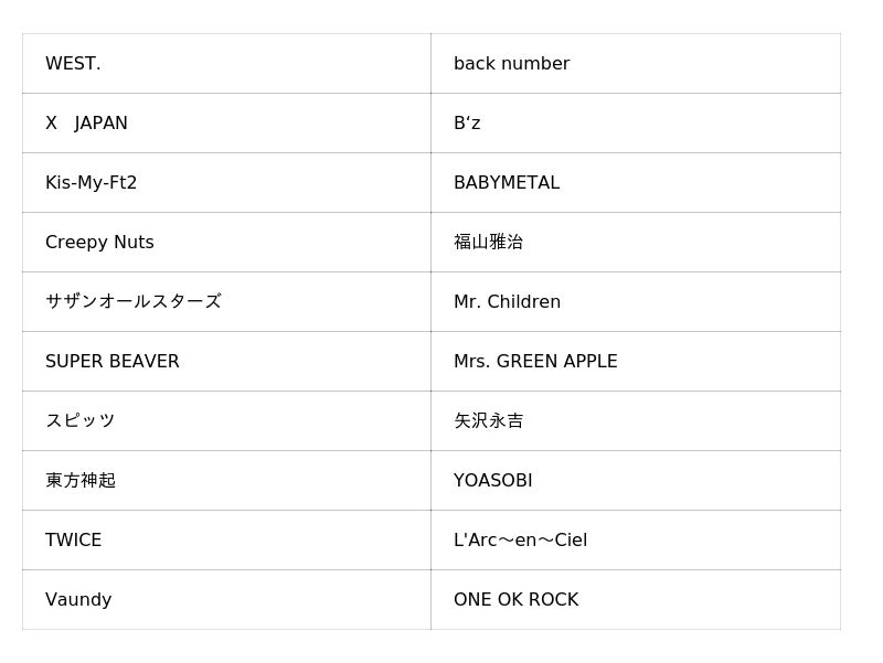 ・音楽ライブ放送・配信アーティスト(参考例 一部抜粋)