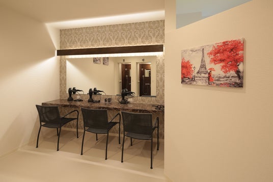 女性用シャワールームのパウダールーム。ドライヤーやヘアアイロンなども無料で完備。