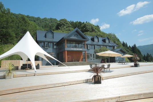 センターハウス外観。綺麗なウッドデッキで、まるでグランピング施設のような雰囲気が漂う。