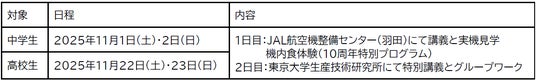 本ワークショップでは、次世代を担う人材育成を目的として、JALと東大生研次世代育成オフィス(*3)が、航空分野に触れる機会を中高生に無料で提供しています。「現地・現物・現人」に触れることに重きを置き、最先端の技術が随所に詰まった「飛行機」を教材として、「学校での学習が社会の技術・課題解決にどのように繋がるのか」を、実際に体験しながら学んでいく次世代育成教育プログラムです。