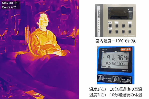 -10℃環境下で「AURORA DOWN」を使用して横になって実際に寝て測定
