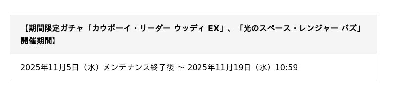 ■期間限定ガチャに新キャラクター「カウボーイ・リーダー ウッディ EX」、「光のスペース・レンジャー バズ」が登場!