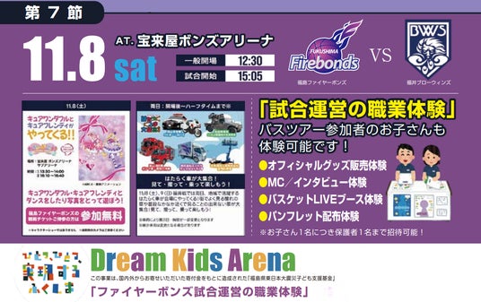 2025年4月にリニューアルオープンした宝来屋ボンズアリーナでの試合観戦に加え、当日来場した子どもたちも参加可能な試合運営に関わる職業体験”ドリームキッズアリーナ”や福島ファイヤーボンズ渡邉 拓馬GMをお招きして”目標や夢について考える座談会”を開催します。