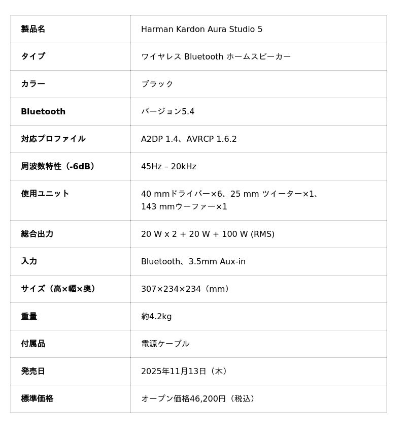 ハーマンインターナショナル株式会社(本社:東京都千代田区、代表取締役社長:桑原拓磨)は、優れた音響技術と洗練されたデザインの融合で世界中の音楽ファンから愛されるオーディオブランド「Harman Kardon (ハーマンカードン)」から、全方位型ワイヤレスBluetoothホームスピーカー「Aura Studio」シリーズから新しく「Aura Stidio 5(オーラ スタジオ 5)」を2025年11月13日(木)より発売いたします。