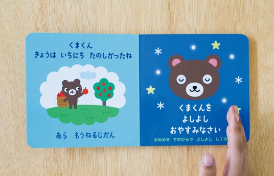 最初の着想は、子供が通っていた保育園の先生から寝かしつけのときまぶたを上から下によしよしするとねちゃうよと言われたことでした。親子で楽しいおやすみタイムになるといいなという思いで作った絵本です。(パイロットインキ 伊藤)