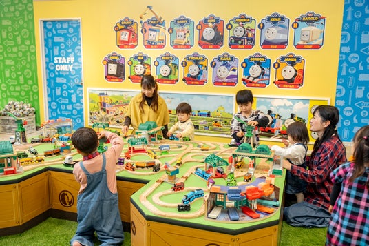 「トーマスステーション」は、親子で身体を動かして遊べる屋内型プレイグラウンドです。「トーマスのわくわくひろば」には、人気の木製レールの大きな試遊台のほか、レールを飛び越える元気なトーマスのイラストを背に滑る「みどりの丘すべりだい」や、ブレンダム・ドックの港を模した「ボールプール」、オリジナルデザインの「クッション遊具」など、楽しいきかんしゃトーマスの世界観の中で、親子そろって遊ぶことができます。